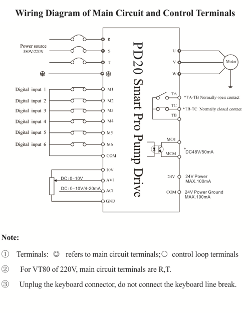 4 Routes: 1. Keypad control; 2. Digital input terminal control; 3. Communication control; 4. Water inlet pressure control |