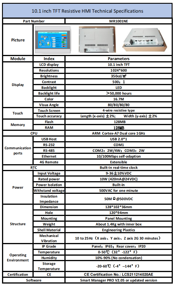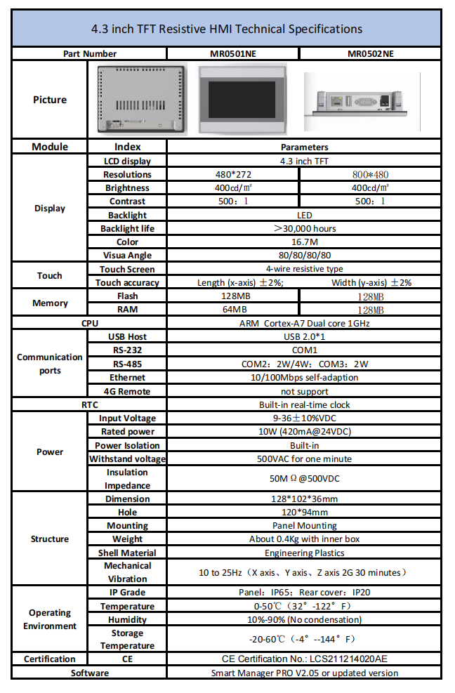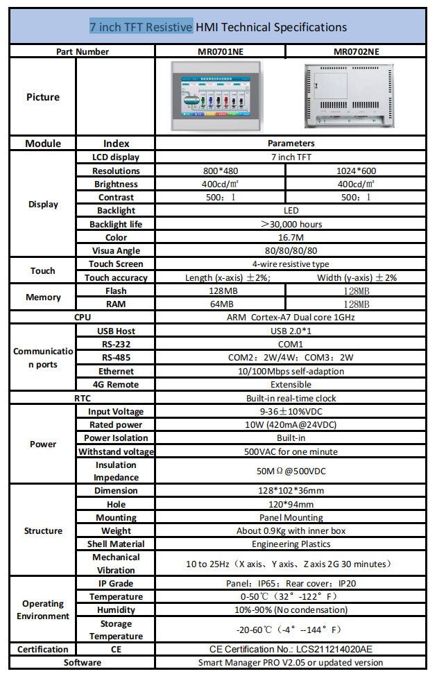 4.3 inch / 7 inch / 10.1 inch TFT resistive screen,1COM RS-232,2COM RS-485, 1Ethernet, USB host&device, 24 VDC